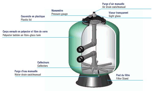 Standardni pješčani filteri ili uređaji za filtriranje koji su najzastupljeniji kod privatnih, ali i javnih bazena za plivanje, sastoje se od samog filtera (kučišta – zatvorene posude) unutar kojeg se nalazi kvarcni pijesak, stakleno-minaralna ili slična ispuna i PVC cjevovod za distribuciju vode, te PVC kolektor putem kojeg cirkulacijska crpka filtriranu vodu vraća u bazen, izbornog 4-putnog ili 6-putnog ventila i cirkulacijske crpke.